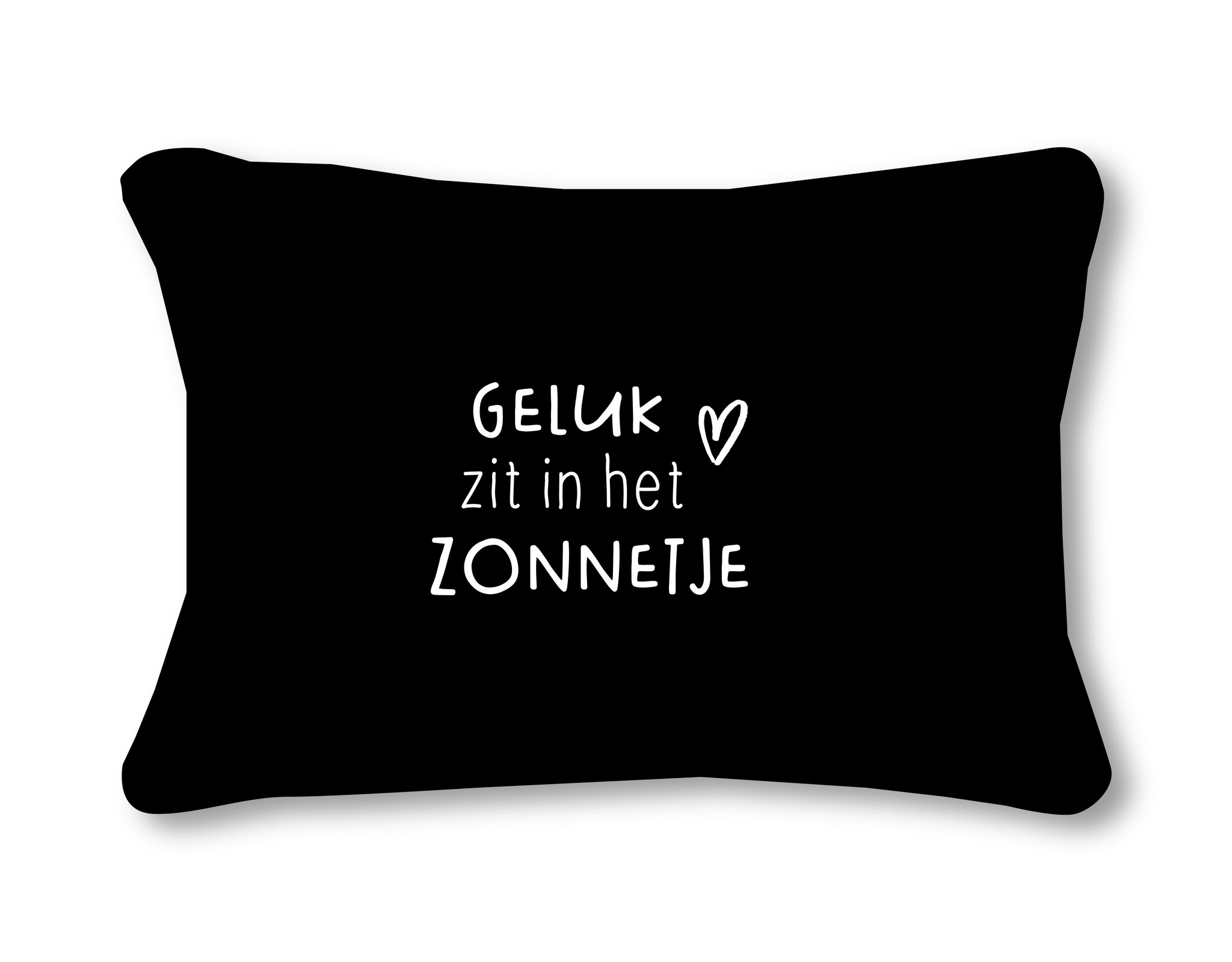 Buitenkussen 50x30 zwart met tekst Geluk zit in het zonnetje– waterafstotend tuinkussen
