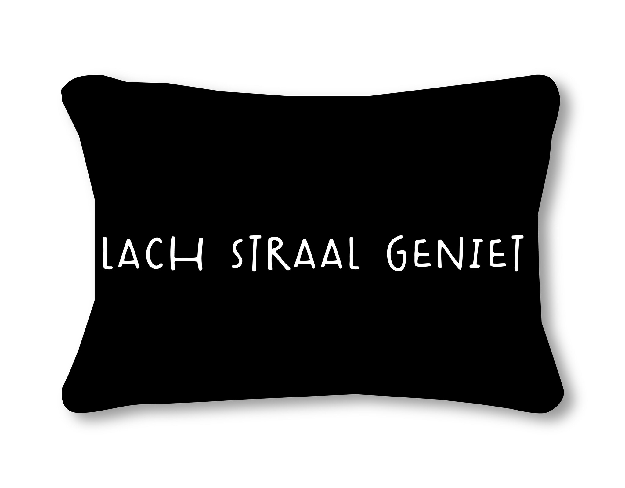 Buitenkussen 50x30 zwart met tekst Lach Straal Geniet – waterafstotend tuinkussen