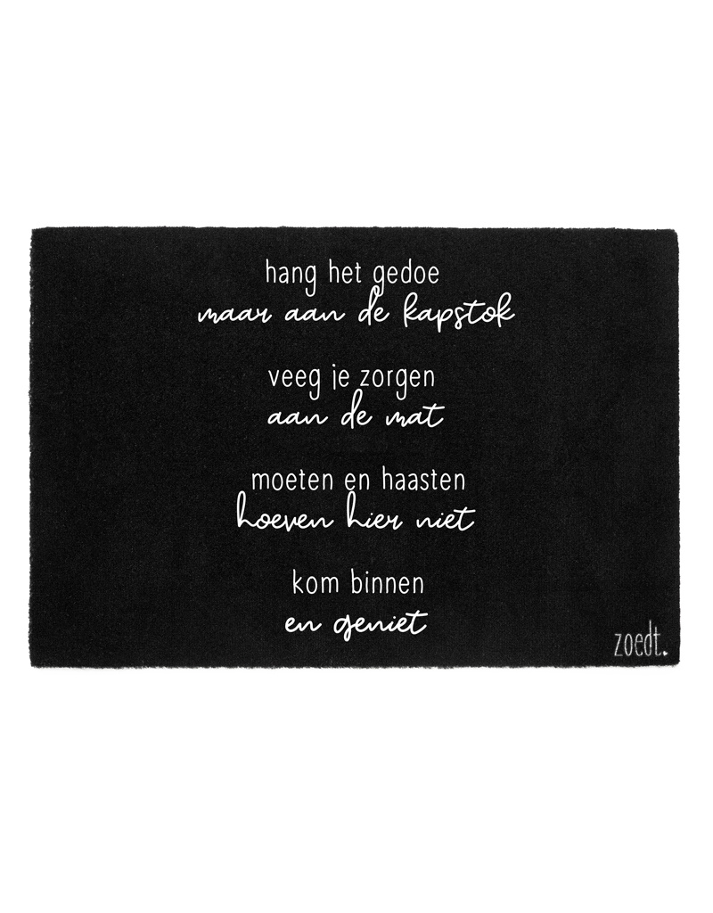 Deurmat zwart met gedicht 'Kom binnen en geniet'