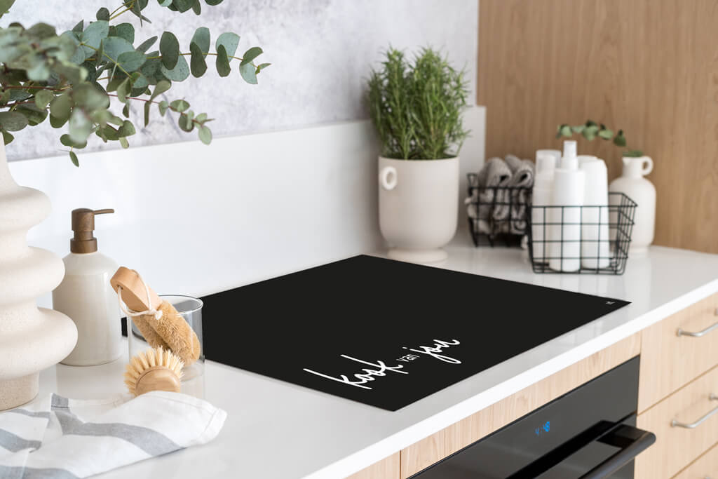 Zwarte inductiebeschermer met witte tekst 'Kook van jou'