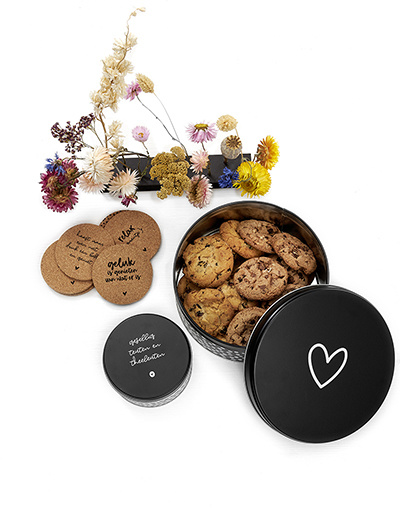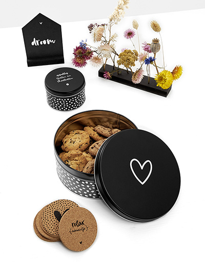 Koffie (of thee) met een koekje wordt een feestje met deze leuke koektrommel. Deze trommel hoort niet in de kast, maar verdient een mooi plekje in de keuken of op tafel. De koektrommel heeft een mooie mat zwarte uitstraling en heeft aan de zijkant een stippen patroon. Bovenop de trommel staat een hartje. Cadeautip: vul deze koektrommel en geef hem cadeau!