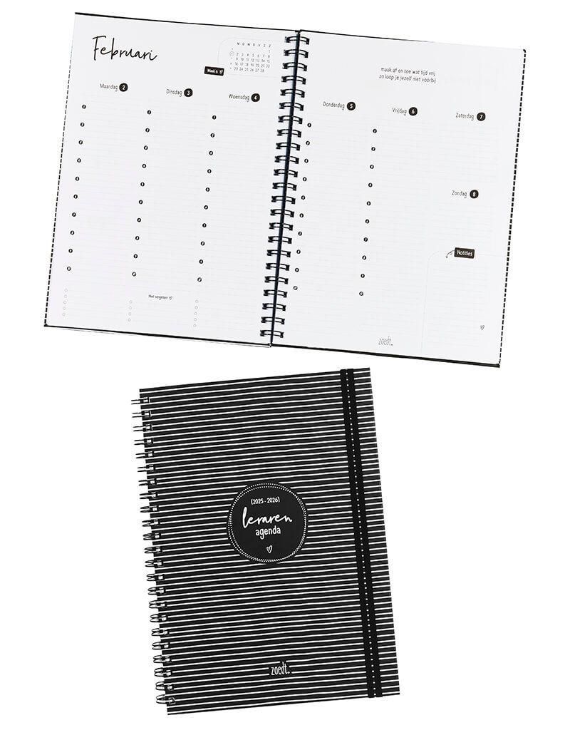 Plan jouw schooljaar overzichtelijk met de A4 Lerarenagenda 2025-2026! Met een stevige ringband, elastieken, veel schrijfruimte en handige extra’s zoals roosters, cijferpagina’s en leuke Zoedt-quotes. Limited Edition, dus wees er snel bij!
