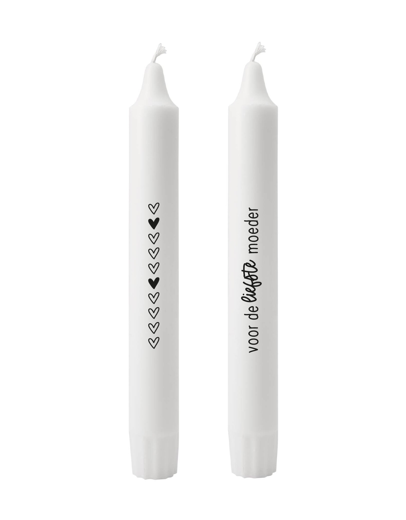 Op de ene kaars staan subtiele hartjes, op de andere de tekst ‘Voor de liefste moeder’. Een stijlvolle en persoonlijke manier om jouw waardering te laten zien.