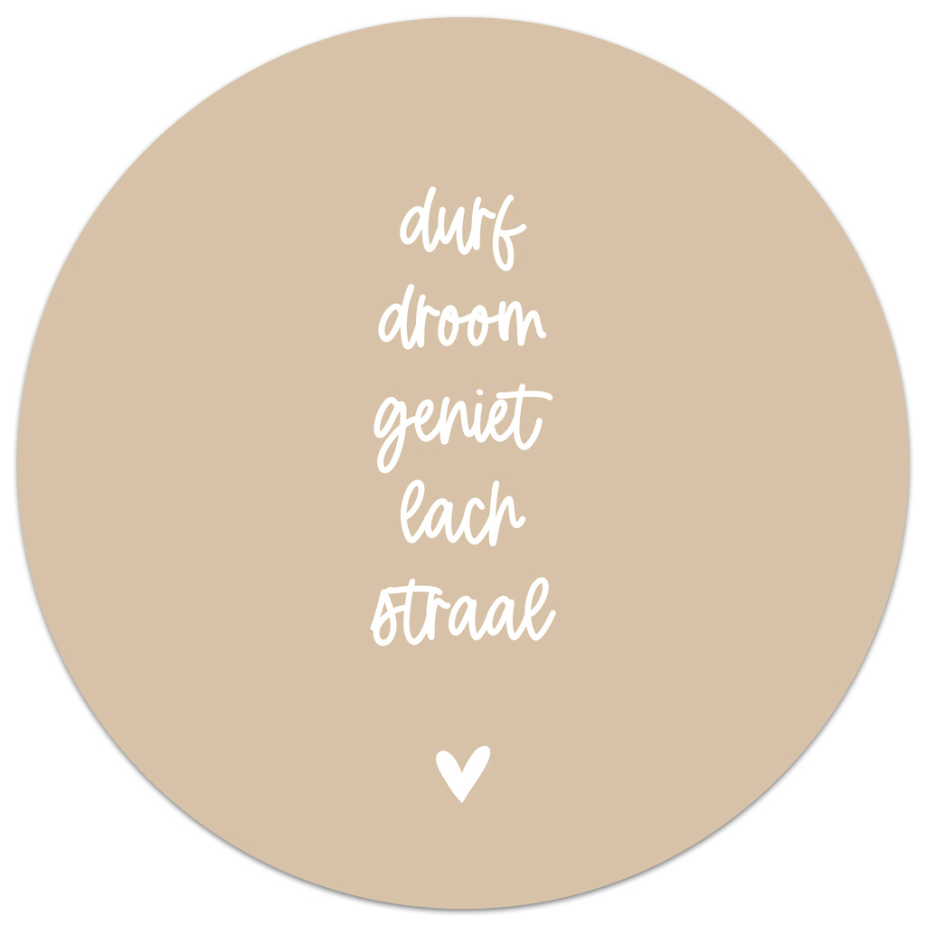 Muurcirkel zand met tekst 'Durf, droom, geniet...'