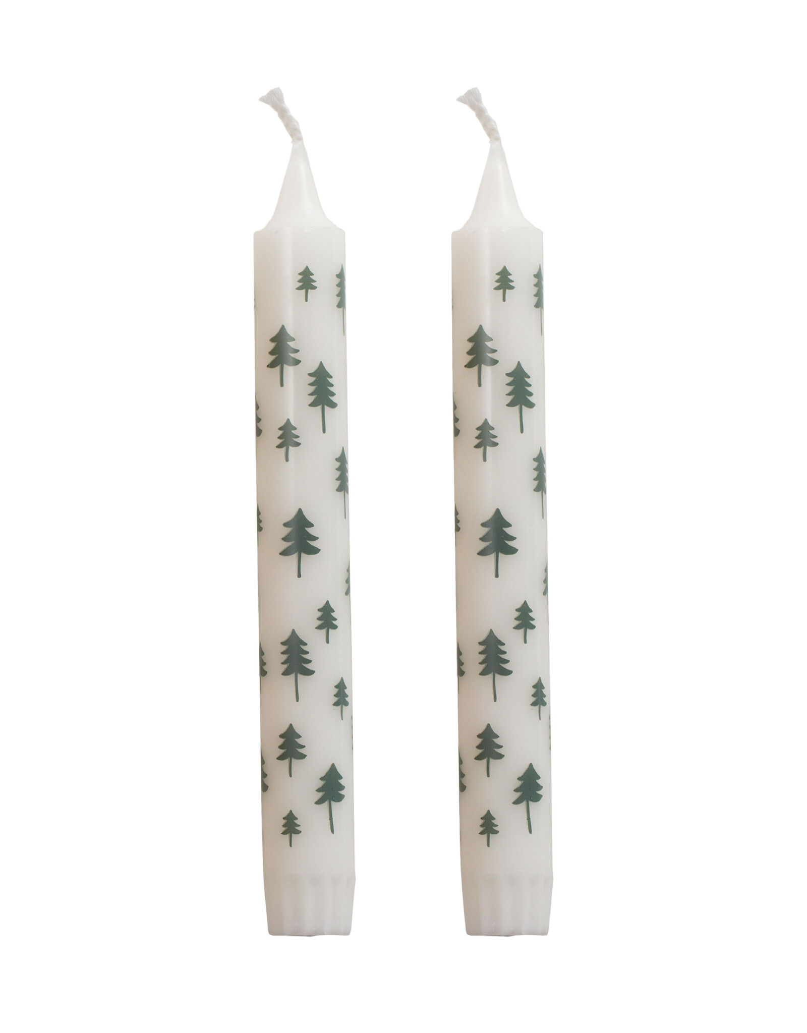 Deze set van 2 kaarsen is een perfect cadeautje om iemand mee te verrassen. De set bestaat uit 2 witte kaarsen met groene kerstboompjes .