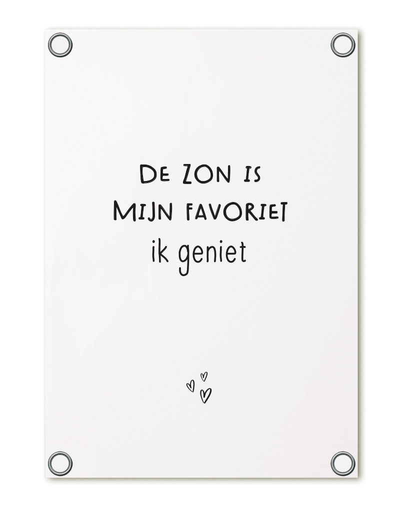Tuinposter wit met tekst 'De zon is mijn favoriet, ik geniet' – buitenposter voor tuin & terras
