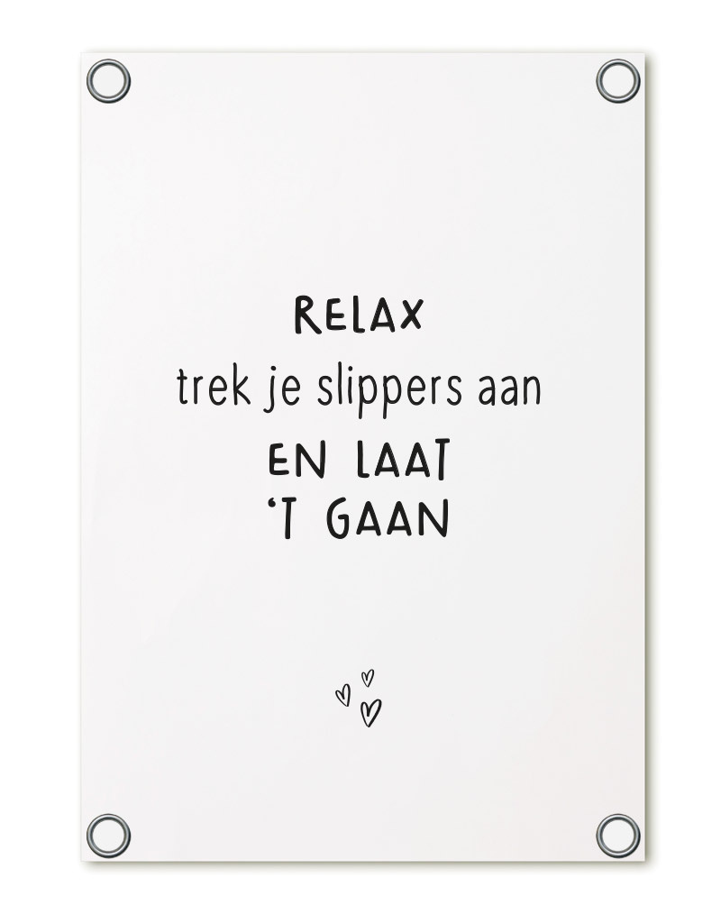 Tuinposter wit met tekst 'Relax trek je slippers aan en laat 't gaan' – buitenposter voor tuin & terras