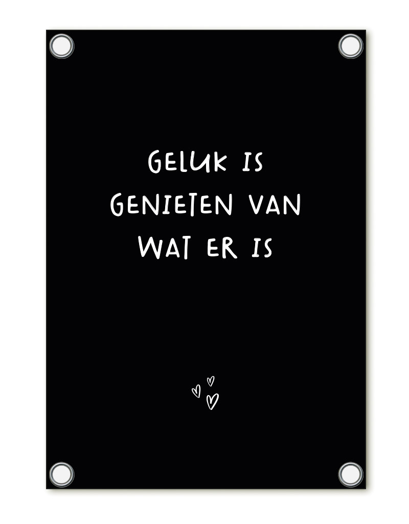 Tuinposter zwart met tekst 'Geluk is genieten van wat er is'– buitenposter voor tuin & terras