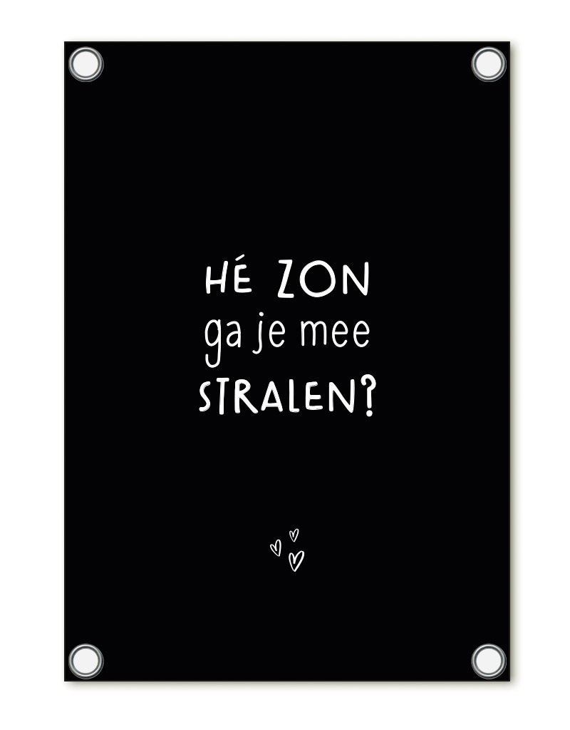 Tuinposter zwart met tekst 'Hé zon ga je mee stralen?' – buitenposter voor tuin & terras
