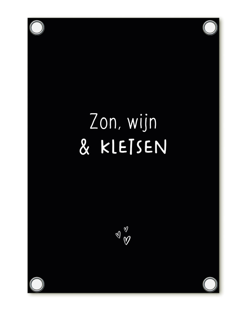 Tuinposter zwart met tekst ''Zon, wijn en kletsen' – buitenposter voor tuin & terras
